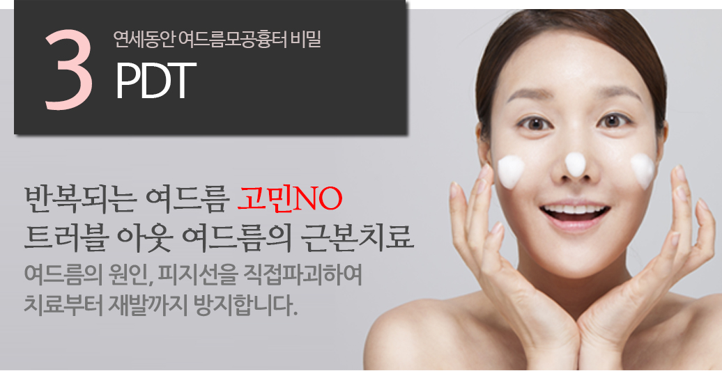 PDT (PhotoDynamicTherapy) ±¤¿ªµ¿ Ä¡·á´Â ºû¿¡ ¹ÝÀÀÇÏ´Â ±¤°¨ÀÛÁ¦¸¦ ÇǺο¡ µµÆ÷ÇÑ ÈÄ, ¿©µå¸§ ÇÇÁö ¸ð³¶¿¡ Èí¼ö ½ÃŲ ÈÄ, ƯÁ¤ ÆÄÀåÀÇ ºûÀ» Á¶»çÇÏ¿© ¿©µå¸§ÀÇ ±âº»º´º¯ÀÎ º´µç ÇÇÁö¸ð³¶À» Á¦°ÅÇÏ´Â È¿°ú·Î ¿©µå¸§À» °³¼±½Ãŵ´Ï´Ù.
